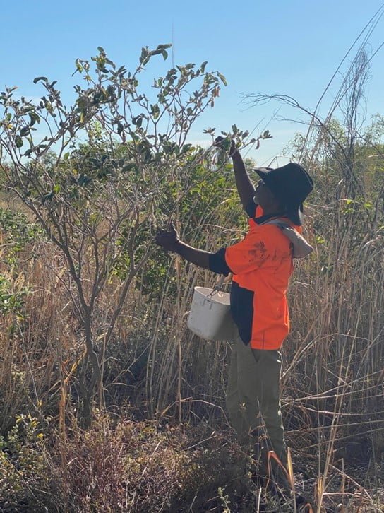 Indigenous seed collector assessing fruit maturity on Crotalaria cunninghamii, an important nitrogen-fixing pioneer shrub in post-mining ecological restoration in the northeast Kimberley region of Western Australia. Image credit: Adam Guest